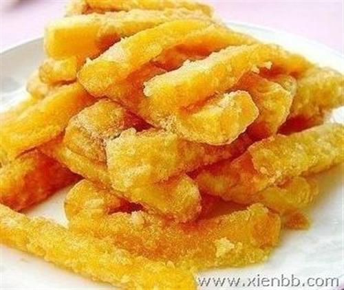 4.蛋黄炒碎后,把滤好水的南瓜条倒进翻炒,使南瓜条均匀蘸满咸蛋黄;